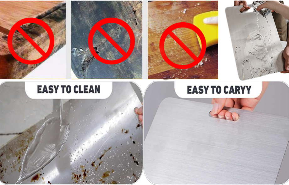 • Wood/Bamboo:- Natural materials can let bacteria and mold grow, in grooves and cuts, even if invisible, which can contaminate your food over time resulting in you feeling ill. They also absorb odors & stain easily.